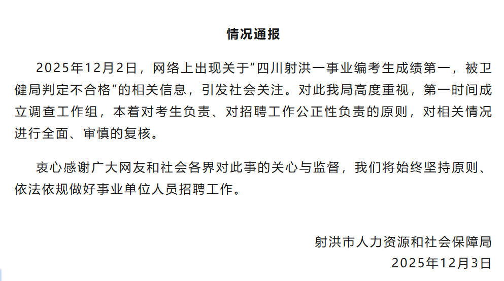 2025年12月2日,网络上出现关于“四川射洪一事业编考生成绩第一,被卫健局判定不合格”的相关信息,引发社会关注。