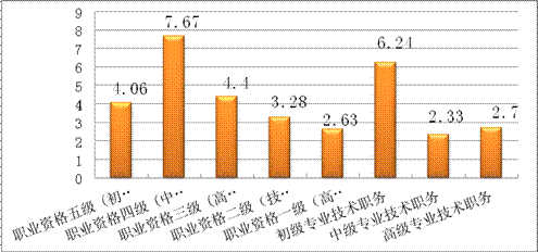 从技能人才供求分析来看,各技术等级需求均大于供给,求人倍率相对较高的是职业资格四级(中级技能)、初级专业技术职务和职业资格三级(高级技能),分别为7.67、6.24和4.4。