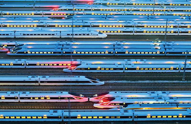 截至2022年末,我国综合交通网总里程超过600万公里,建成全球最大的高速铁路网、全球最大的高速公路网、世界级港口群。图为2023年6月20日凌晨,动车组列车停靠在南京动车段南京南动车运用所存车线上。 人民图片 方东旭/摄