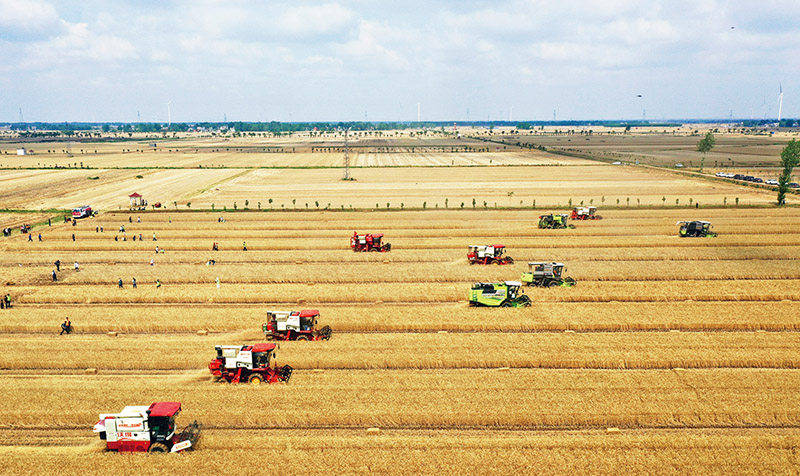 我国农业综合生产能力稳步提升,粮食产量连续8年稳定在1.3万亿斤以上,谷物基本自给、口粮绝对安全,确保中国人的饭碗牢牢端在自己手中。图为5月24日,河南省2023年小麦机收减损技能大比武活动在南阳市唐河县举行。 新华社记者 张浩然/摄
