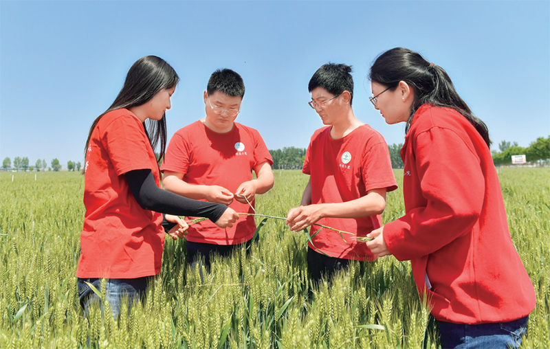 2023年5月1日,习近平总书记给中国农业大学科技小院的学生回信,强调:“党的二十大对建设农业强国作出部署,希望同学们志存高远、脚踏实地,把课堂学习和乡村实践紧密结合起来,厚植爱农情怀,练就兴农本领,在乡村振兴的大舞台上建功立业,为加快推进农业农村现代化、全面建设社会主义现代化国家贡献青春力量。”图为5月13日,科技小院的师生在河北省曲周县“绿色吨半粮”万亩示范基地查看麦情。 新华社记者 赵鸿宇/摄