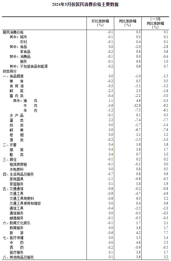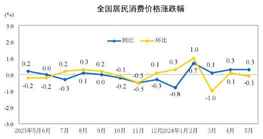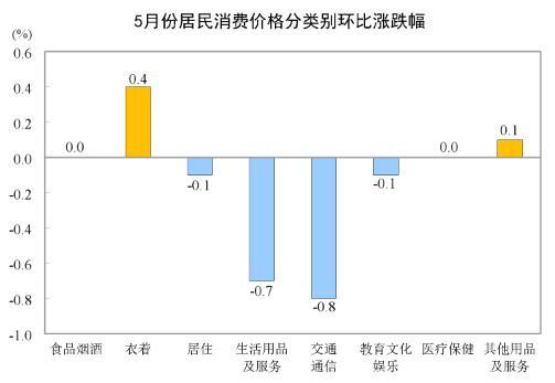 5月份,全国居民消费价格环比下降0.1%。其中,城市下降0.1%,农村下降0.1%;食品价格持平,非食品价格下降0.2%;消费品价格下降0.1%,服务价格下降0.1%。