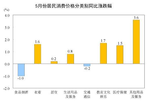 5月份,食品烟酒类价格同比下降1.0%,影响CPI(居民消费价格指数)下降约0.28个百分点。食品中,蛋类价格下降7.4%,影响CPI下降约0.05个百分点;鲜果价格下降6.7%,影响CPI下降约0.15个百分点;畜肉类价格下降2.2%,影响CPI下降约0.07个百分点,其中猪肉价格上涨4.6%,影响CPI上涨约0.05个百分点;鲜菜价格上涨2.3%,影响CPI上涨约0.05个百分点;粮食价格上涨0.5%,影响CPI上涨约0.01个百分点。