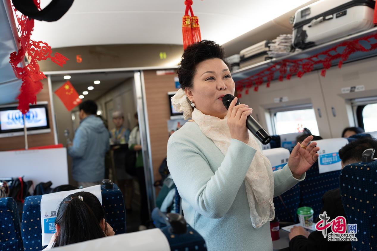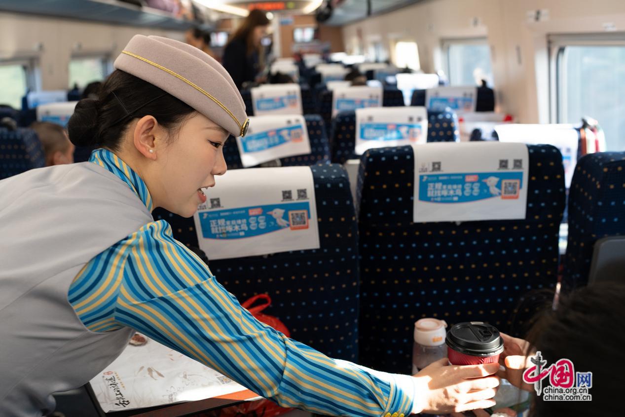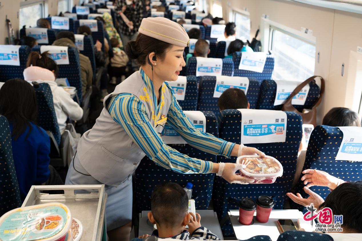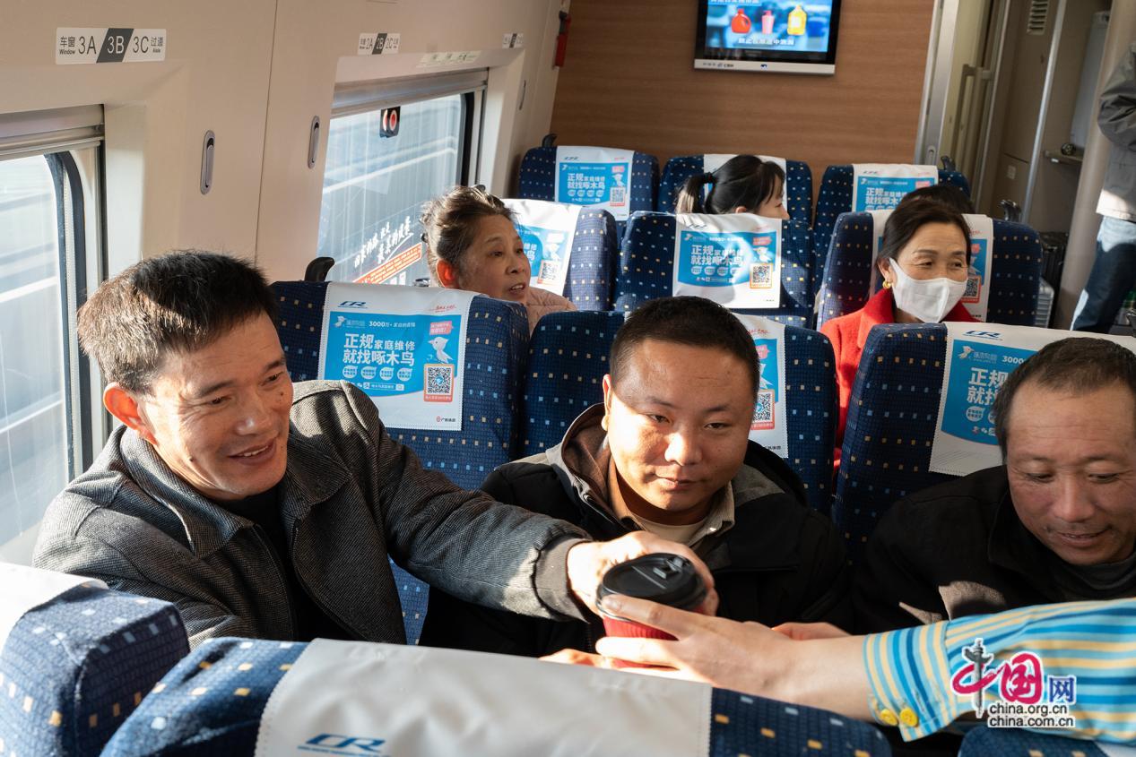 返乡专列上安排了写春联“福”字送工友活动。返乡旅途中,车厢里洋溢着浓浓的年味。