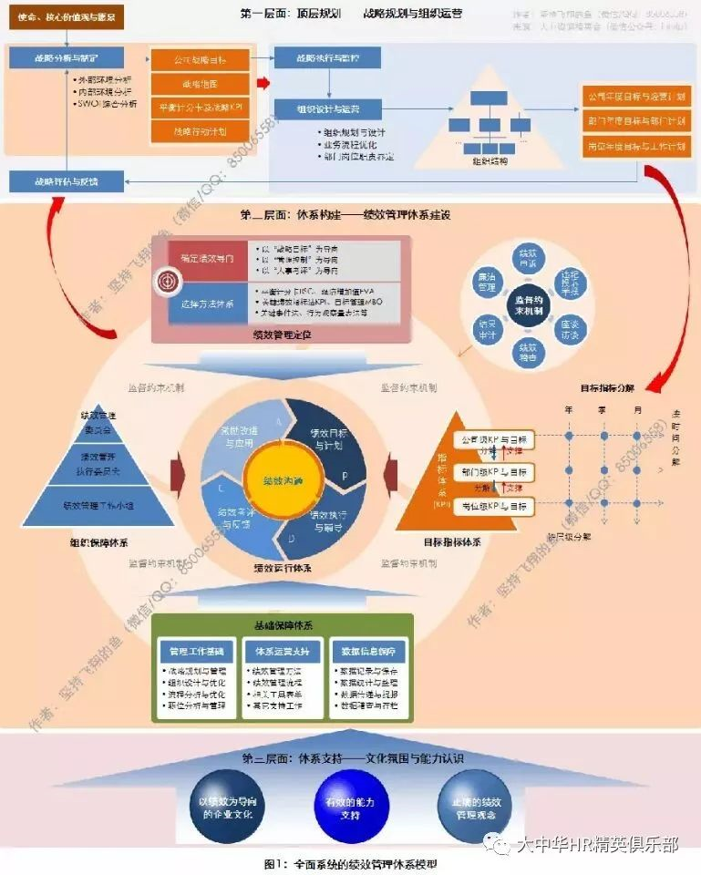 因此,构建企业全面系统的绩效管理体系,不能把绩效管理仅作为人力资源管理的一个专业模块,而要从公司的战略和运营层面进行整体思考和系统设计,包括“战略规划与组织运营、绩效管理体系建设及文化氛围与能力认识”三个层面的分析、规划和建设。这三个层面的协同运作,共同构成了企业全面系统的绩效管理体系,即上一个层面指导下一个层面的系统建设,下一个层面支撑上一个层面的系统运营。如图1所示。其中:第一层面:顶层规划——战略规划与组织运营,既是企业经营的目标和规划,也是绩效管理体系建设的最终目的和导向,战略规划确定了企业的发展方向和目标,组织运营确保公司战略能够落实执行;第二层面:主体建设——绩效管理体系建设,是绩效管理体系的主体运营部分,直接支撑和服务于企业战略的实现;第三层面:体系支持——文化氛围与能力认识,通过营造高绩效的企业文化,提升各级人员的管理能力和专业技能,增强员工的绩效管理思想意识,让员工正确认识绩效管理,支撑绩效管理体系的建立和运营,确保公司的运营效率和战略实现。