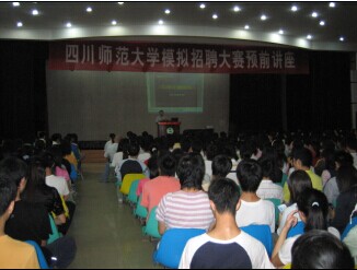 2007年9月11日晚, “模拟招聘大赛”预前讲座,在四川师范大学本部多功能会议厅拉开帷幕,前景咨询执行总监杨总受邀作为主讲嘉宾,做了题为“未雨绸缪 轻松就业”的开篇讲座。