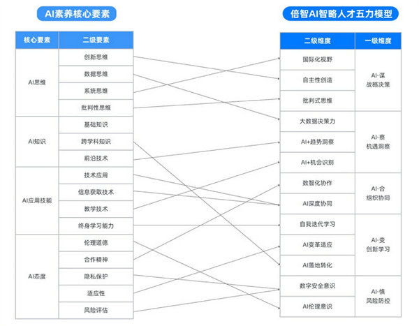 我们通过上述的业务视角去重新审视AI素养框架,推导得出倍智“AI智略人才模型”。